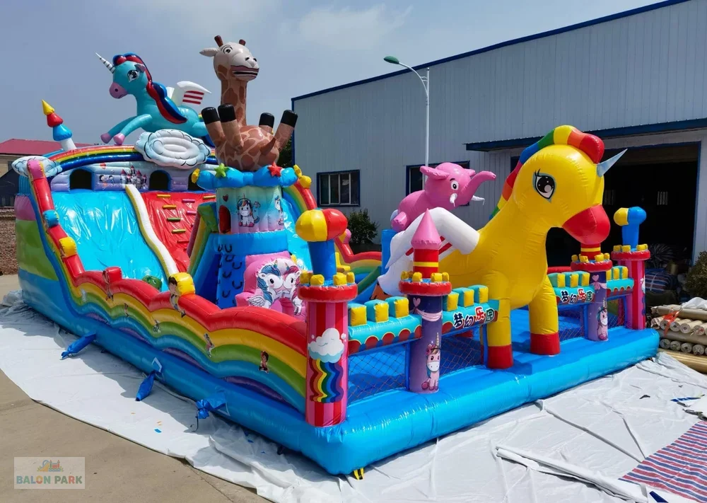 Şişme Oyun Parkı Unicorn 12x6x7 metre ölçülerinde tasarlanmış, dev boyutlu ve göz alıcı unicorn temasıyla dikkat çeken profesyonel bir şişme oyun alanıdır. 12 metre uzunluk, 6 metre genişlik ve 7 metre yükseklik ölçüleri sayesinde yüksek kapasite sunar ve etkinlik alanlarında maksimum görsel etki sağlar. Ön cephede yer alan 3D unicorn figürü ve canlı renk tasarımı özellikle kız çocuklarının yoğun ilgisini çeker. İçerisinde geniş zıplama alanı, kaydırak, tırmanma bölümü ve engel parkuru bulunur. Dayanıklı, kalın PVC branda malzemeden üretilmiş olup yoğun ticari kullanıma uygundur. Güvenlik fileleri, yüksek bariyerler ve güçlendirilmiş dikiş sistemi ile güvenli ve uzun ömürlü kullanım sağlar. Festival, belediye etkinliği, okul şenliği, AVM organizasyonu ve kiralama firmaları için yüksek kazanç potansiyeline sahip prestijli bir modeldir.