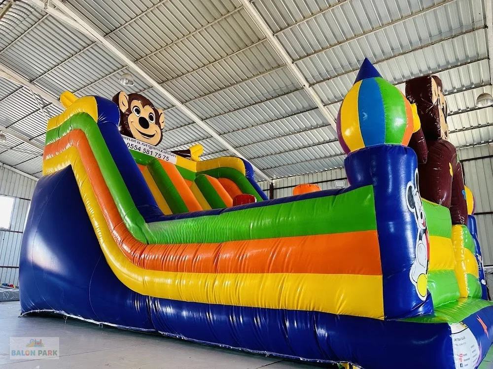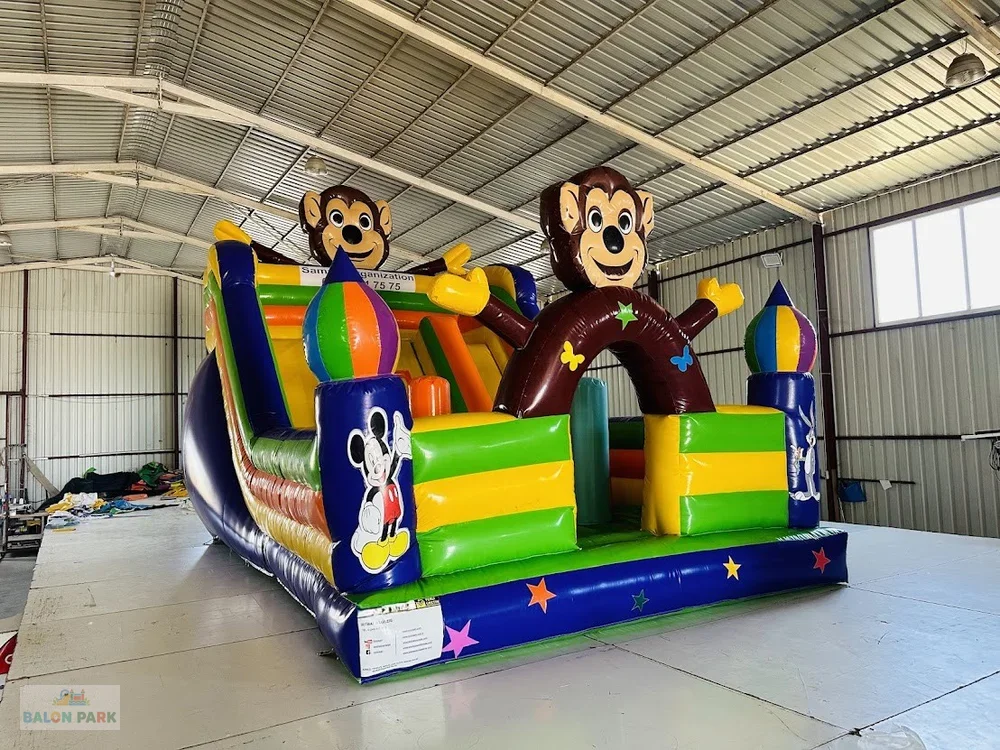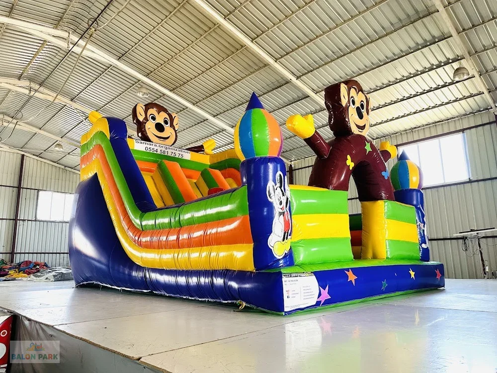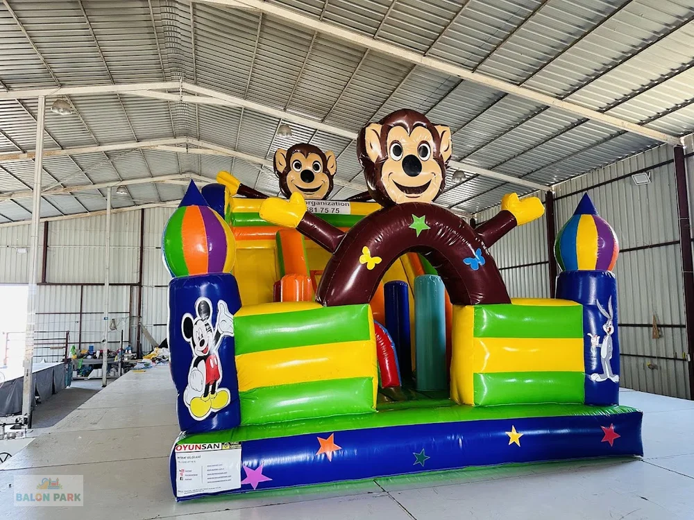 Şişme maymun oyun parkı, orman temalı tasarımı ve sevimli maymun figürleriyle çocuk etkinliklerinde dikkat çeken profesyonel bir şişme eğlence alanıdır. Canlı renkleri ve detaylı konsepti sayesinde doğum günü organizasyonları, okul şenlikleri, festival alanları ve AVM etkinliklerinde yoğun ilgi görür. Geniş iç hacmi; kaydırak, tırmanma alanı, engel parkuru ve zıplama bölümü gibi çoklu aktiviteleri bir arada sunar. Yüksek dayanımlı PVC branda malzemeden üretilmiş olup yan güvenlik fileleri, yüksek bariyerler ve kaymaz yüzey ile maksimum güvenlik sağlar. Hem iç hem dış mekan kullanımına uygundur.