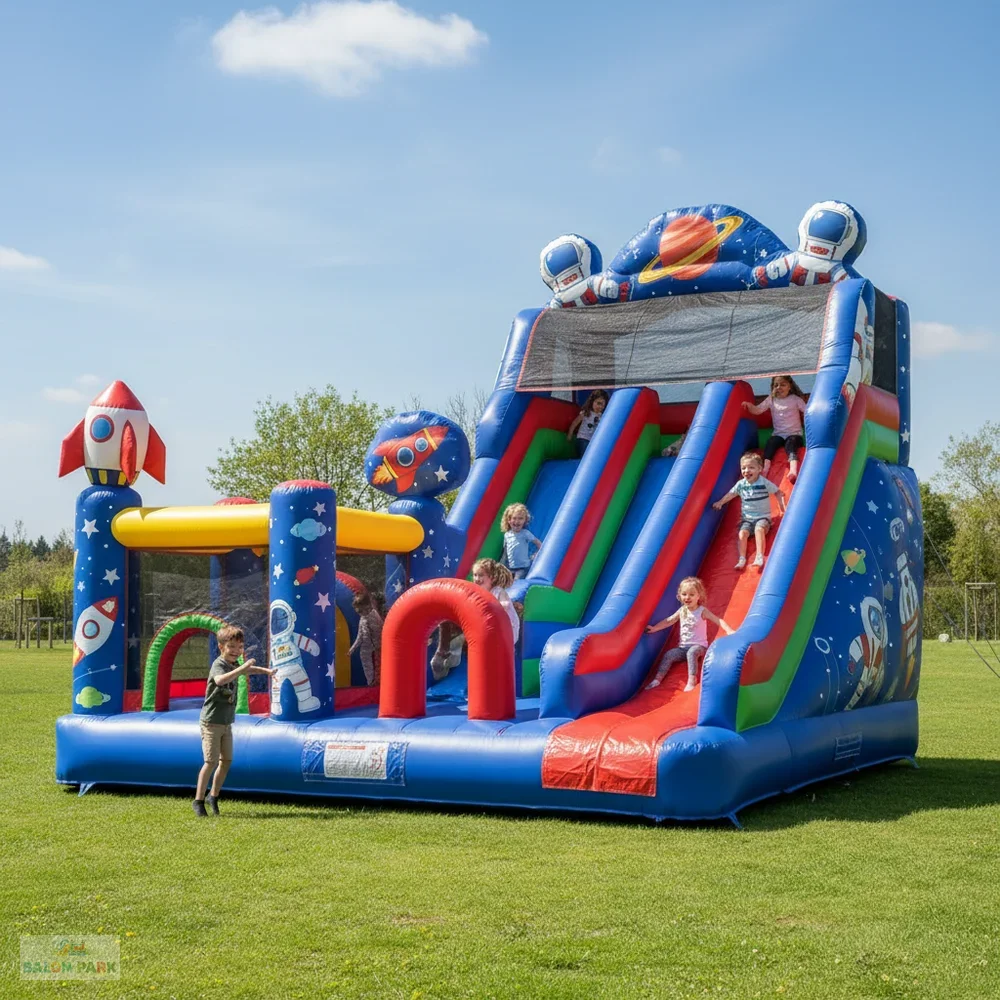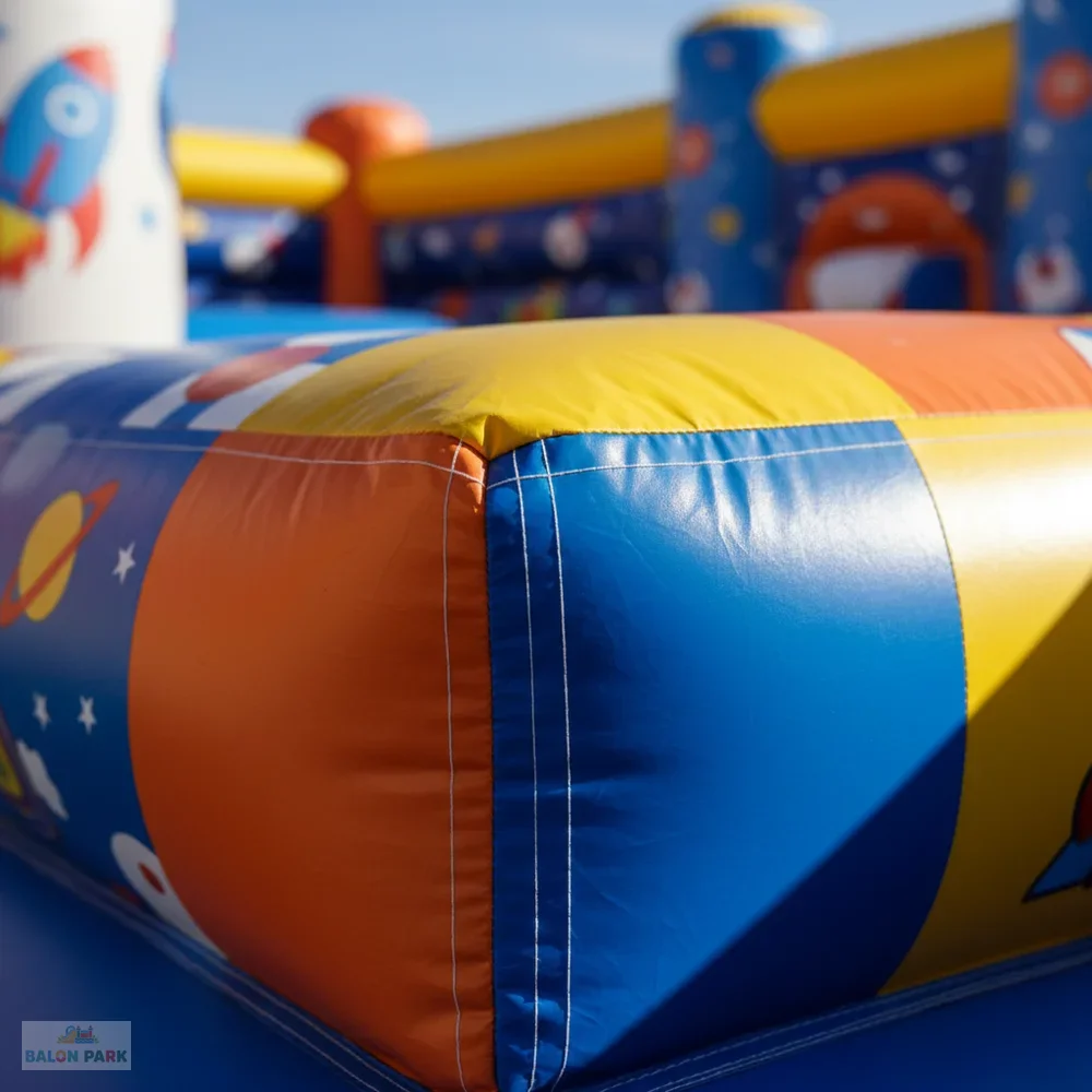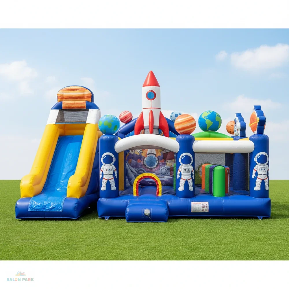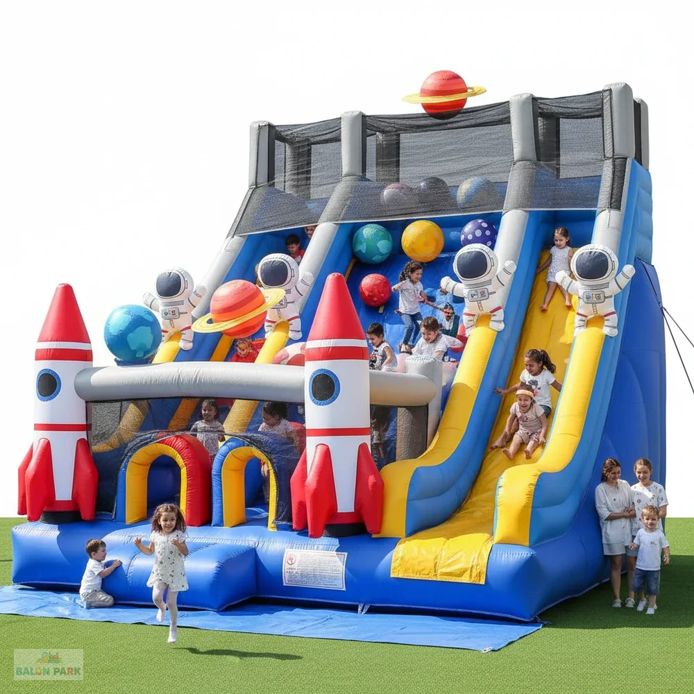 10x6 metre ölçülerinde şişme uzay temalı oyun parkı, çocuklara eğlence dolu bir macera sunan geniş hacimli profesyonel oyun alanıdır. Uzay konseptli tasarımında roket, gezegen ve astronot figürleri ile dikkat çekici görseller kullanılır. Geniş zıplama alanı, kaydırak bölümü ve engelli parkur sistemi sayesinde aynı anda birden fazla çocuğun güvenli şekilde oynamasına olanak tanır. 0,55 mm – 0,70 mm PVC branda kumaştan üretilmiş olup çift dikiş sistemi ile güçlendirilmiştir. Yan güvenlik fileleri ve yumuşak iniş alanı ile maksimum güvenlik sağlar. Doğum günü organizasyonları, okul şenlikleri, belediye etkinlikleri ve kiralama firmaları için yüksek kazanç potansiyeline sahip ideal bir üründür.