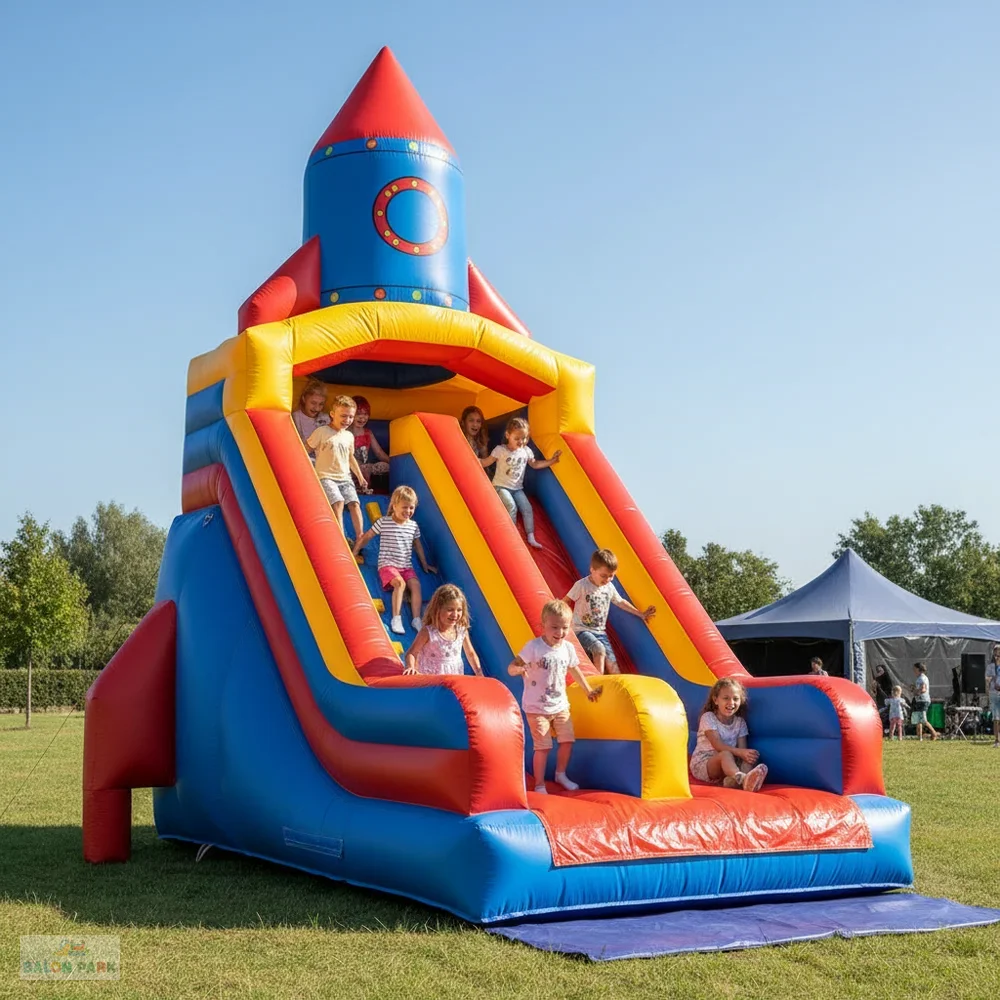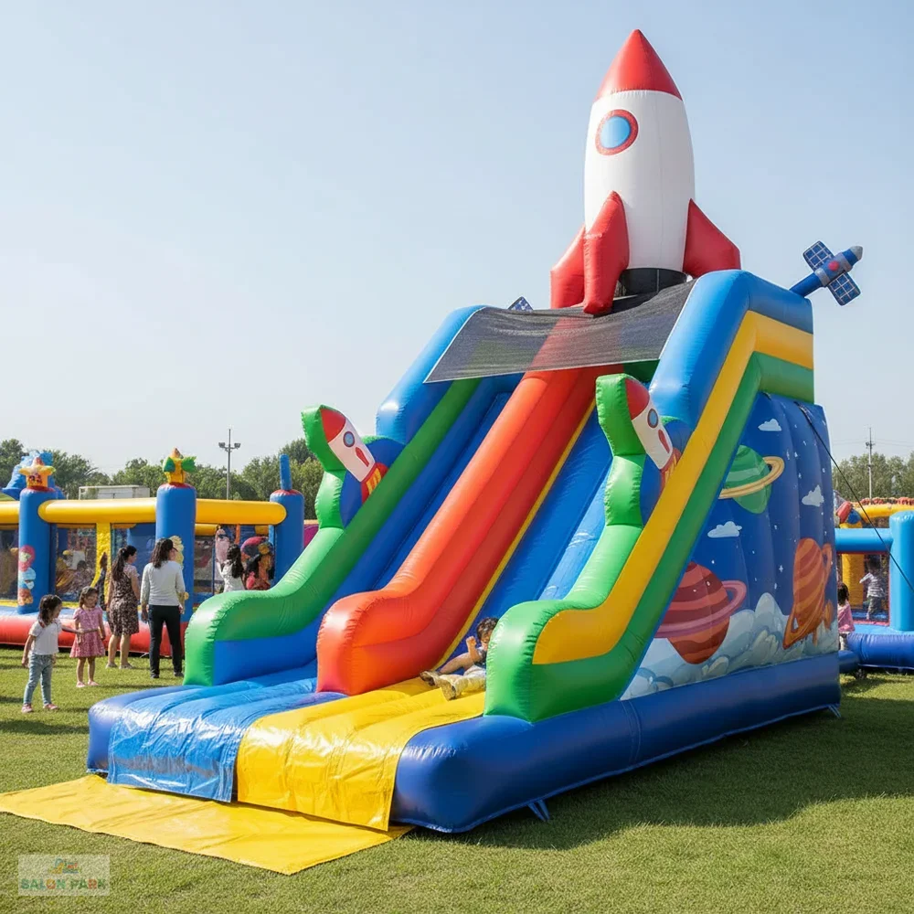 Roket temalı şişme kaydırak 7x5 metre ölçüsüyle hem görsel hem de eğlence açısından öne çıkar. Dayanıklı yapısı, güvenlik önlemleri ve dikkat çekici tasarımı sayesinde çocuk etkinlikleri ve organizasyonlar için ideal bir şişme oyun ürünüdür.