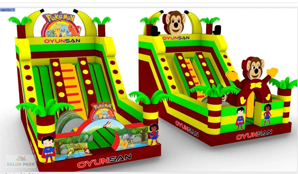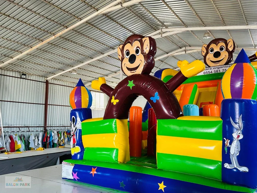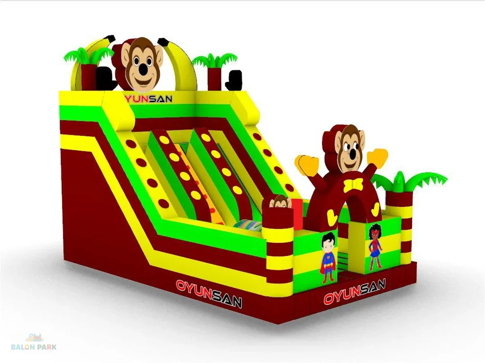 Şişme Monkey Kaydırak 8x5x6 ölçülerinde tasarlanmış, dev boyutlu ve dikkat çekici maymun temalı profesyonel bir şişme kaydırak modelidir. 8 metre uzunluk, 5 metre genişlik ve 6 metre yükseklik ölçüleri sayesinde geniş oyun kapasitesi sunar ve etkinlik alanlarında yüksek görünürlük sağlar. Üst bölümde yer alan 3D maymun figürü ve canlı tropikal renk tasarımı çocukların ilgisini çeker. Dayanıklı ve kalın PVC branda malzemeden üretilmiş olup yoğun ticari kullanıma uygundur. Güvenlik bariyerleri, yan koruma fileleri ve sağlam dikiş sistemi ile güvenli bir oyun deneyimi sunar. Belediye etkinlikleri, festivaller, okul şenlikleri, AVM organizasyonları ve kiralama firmaları için yüksek kazanç potansiyeline sahiptir.