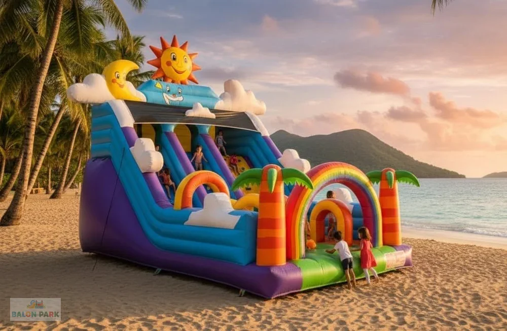 Şişme gökyüzü temalı kaydırak, bulut figürleri ve gökyüzü konseptli tasarımıyla çocuklara eğlenceli ve güvenli bir kayma deneyimi sunar. Canlı renkleri ve dikkat çekici görselliği sayesinde organizasyonlarda ilgi odağı olurken, geniş kaydırak alanı çocukların enerjilerini güvenli şekilde atmalarını sağlar. Yüksek dayanımlı PVC branda malzemeden üretilmiş olup çift dikişli güçlendirilmiş yapısı, güvenlik fileleri ve darbe emici zemin sistemi ile maksimum güvenlik sunar. Doğum günü partileri, okul etkinlikleri, festival ve açık hava organizasyonları için ideal bir tercihtir. Kolay kurulum ve pratik taşıma avantajı ile hem bireysel hem ticari kullanıma uygundur.