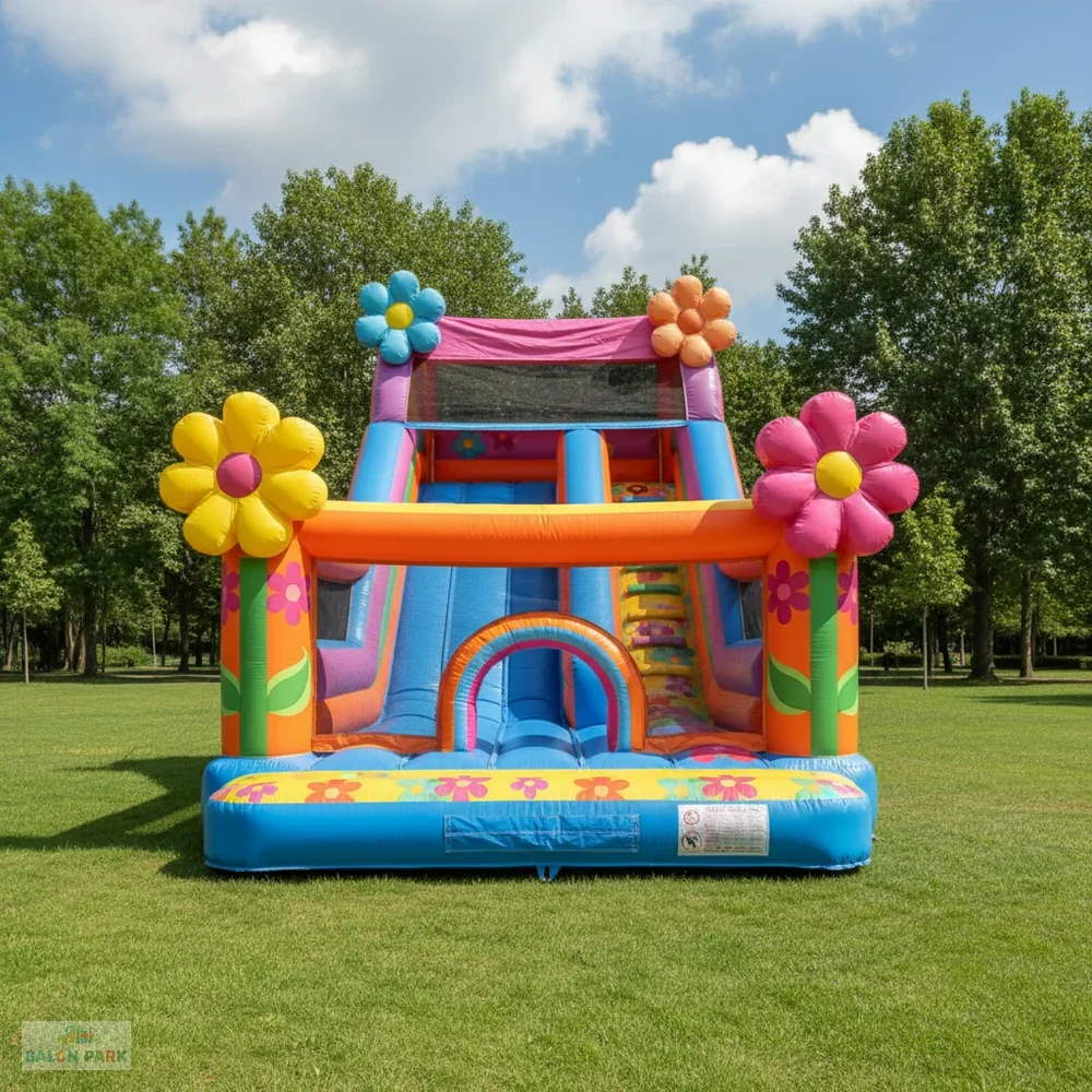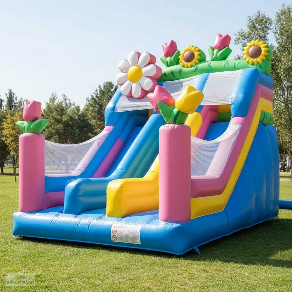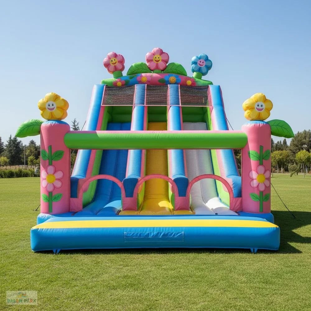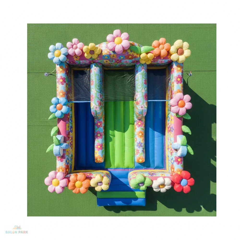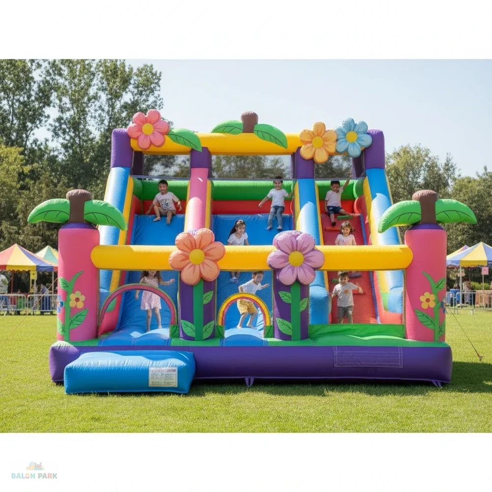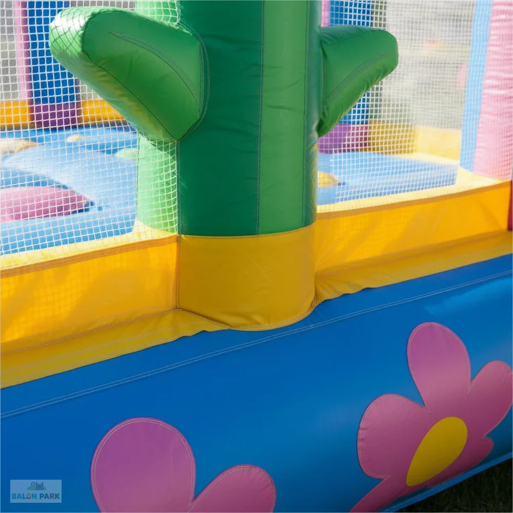 Çiçek temalı kaydırak, doğa konseptli tasarımı ve canlı renkleriyle çocuk etkinliklerinde dikkat çeken şişme oyun parkı modelidir. Büyük çiçek figürleri ve estetik detayları sayesinde doğum günü organizasyonları, okul şenlikleri, bahar festivalleri ve açık hava etkinliklerinde yoğun ilgi görür. Yüksek dayanımlı PVC branda malzemeden üretilmiş olup yan güvenlik fileleri, yüksek bariyerleri ve kaymaz tırmanma alanı ile maksimum güvenlik sunar. Hem iç hem dış mekan kullanımına uygun olan bu şişme kaydırak, elektrikli blower ile hızlı ve pratik şekilde kurulabilir.