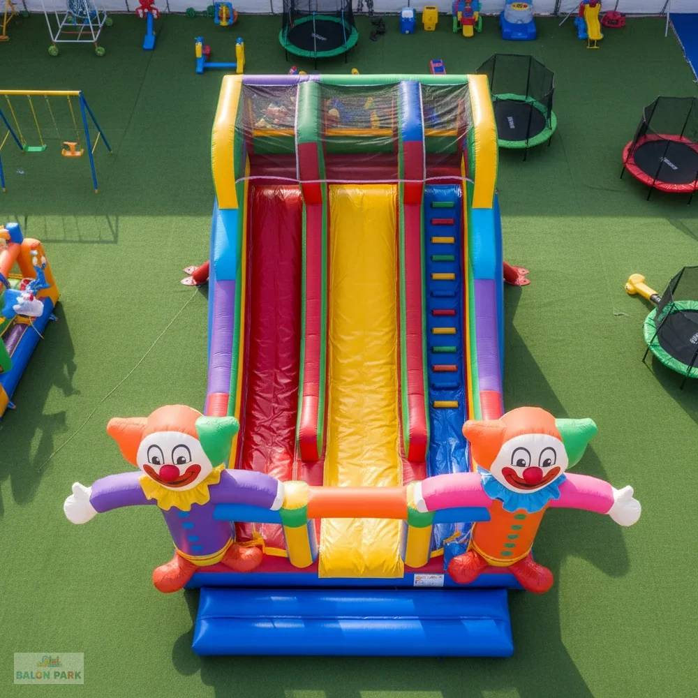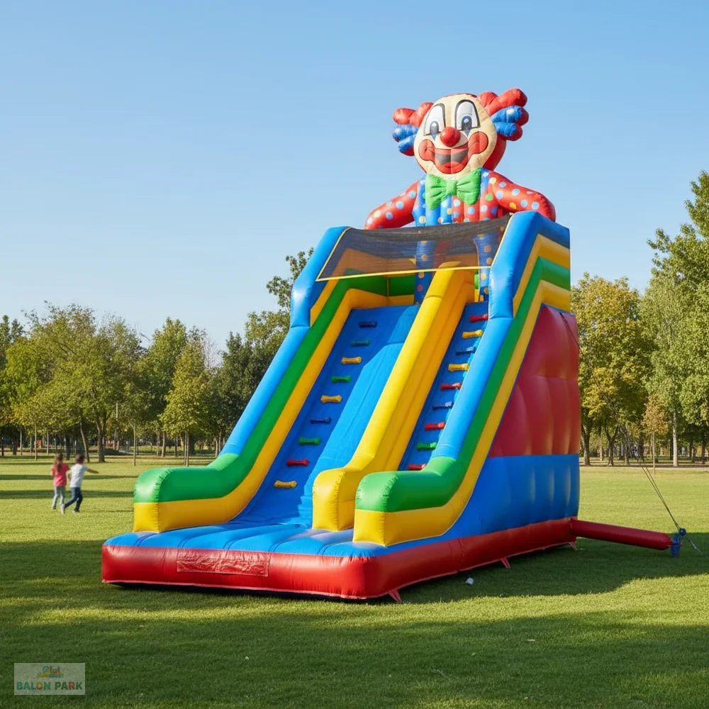 Şişme palyaço temalı kaydırak, renkli tasarımı ve dikkat çekici palyaço figürü ile çocuklara eğlence dolu bir kayma deneyimi sunar. Canlı renk kombinasyonları ve eğlenceli konsepti sayesinde organizasyonlarda ilgi odağı olurken, geniş kaydırak yüzeyi ve güvenli tırmanma alanı çocukların enerjilerini güvenle atmalarını sağlar. Yüksek dayanımlı PVC branda malzemeden üretilmiş olup çift dikişli güçlendirilmiş yapısı, güvenlik fileleri ve darbe emici zemin sistemi ile maksimum güvenlik sunar. Doğum günü partileri, okul etkinlikleri, festival ve açık hava organizasyonları için ideal bir tercihtir. Kolay kurulum ve pratik taşıma özelliği sayesinde hem bireysel hem ticari kullanıma uygundur.