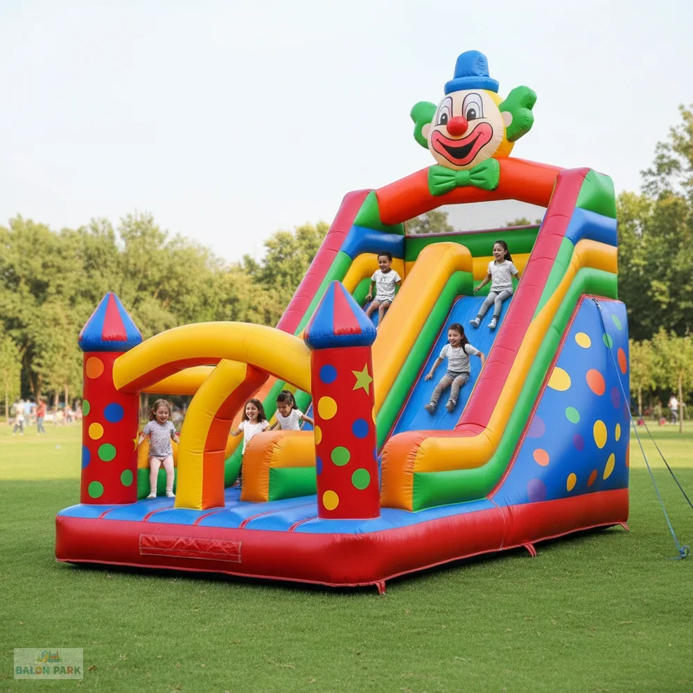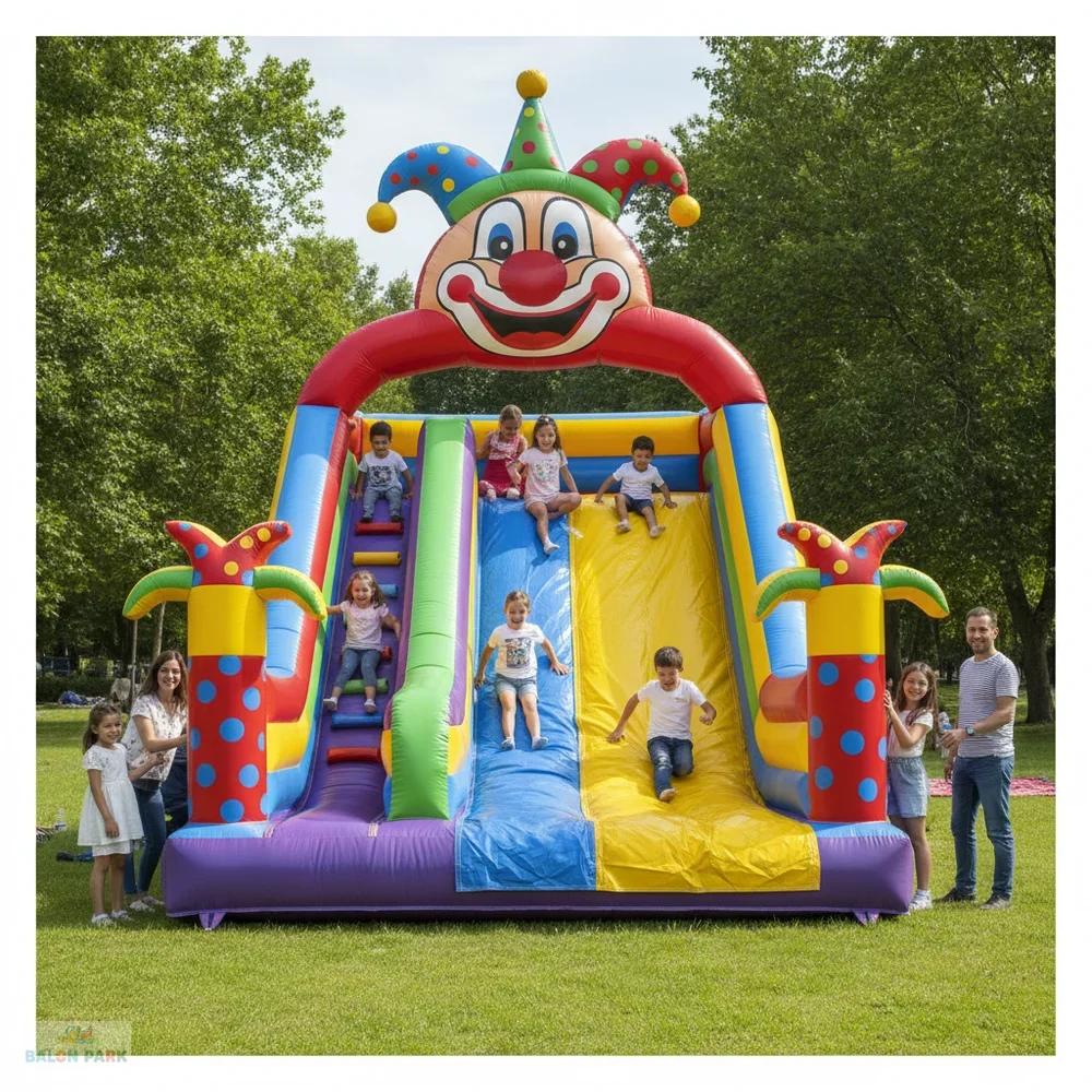 Şişme palyaço temalı kaydırak; renkli ve eğlenceli tasarımı, sağlam yapısı ve güvenli kullanım özellikleri ile çocuklara keyifli bir oyun deneyimi sunar. Organizasyon ve etkinlikler için dikkat çekici, pratik ve dayanıklı bir eğlence çözümüdür.