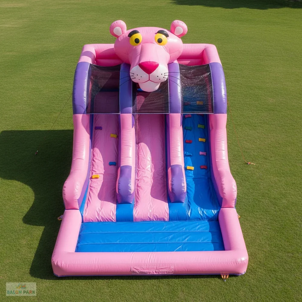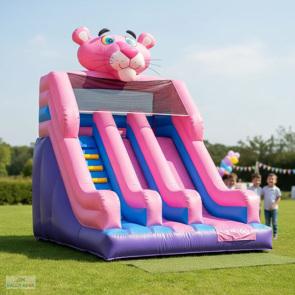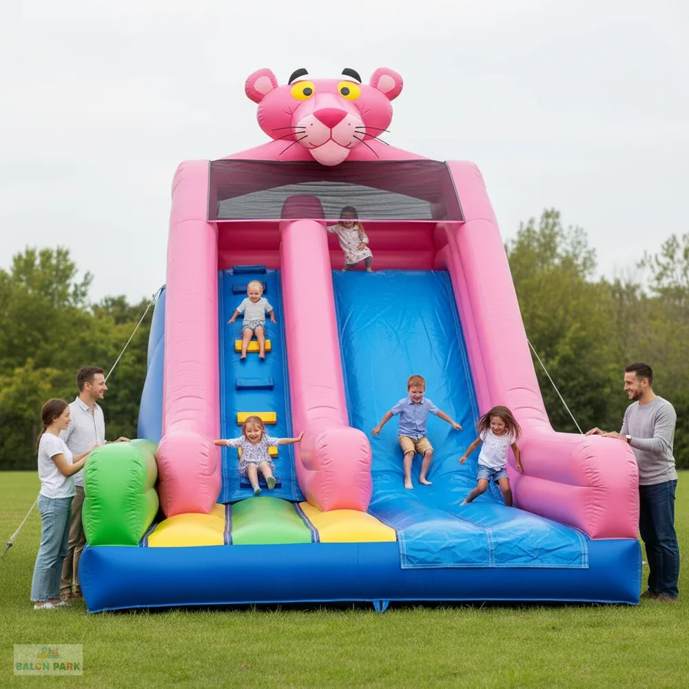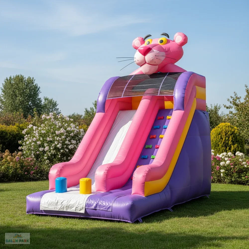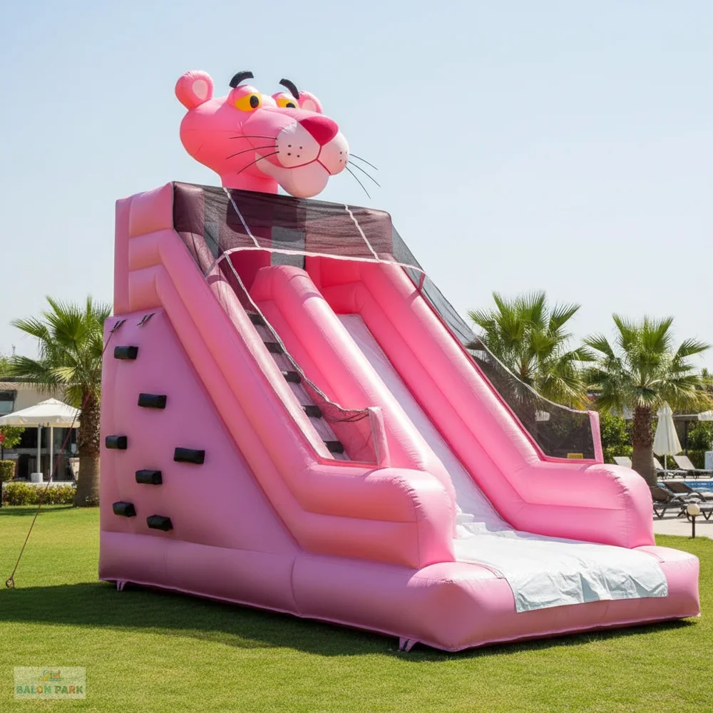 Şişme pembe panter temalı kaydırak; dikkat çekici tasarımı, sağlam yapısı ve güvenli kullanım özellikleri ile çocuklara keyifli bir oyun deneyimi sunar. Organizasyon ve kiralama firmaları için ilgi çekici ve pratik bir eğlence çözümüdür.