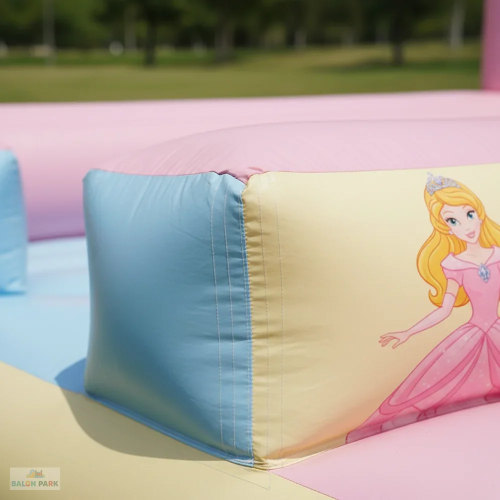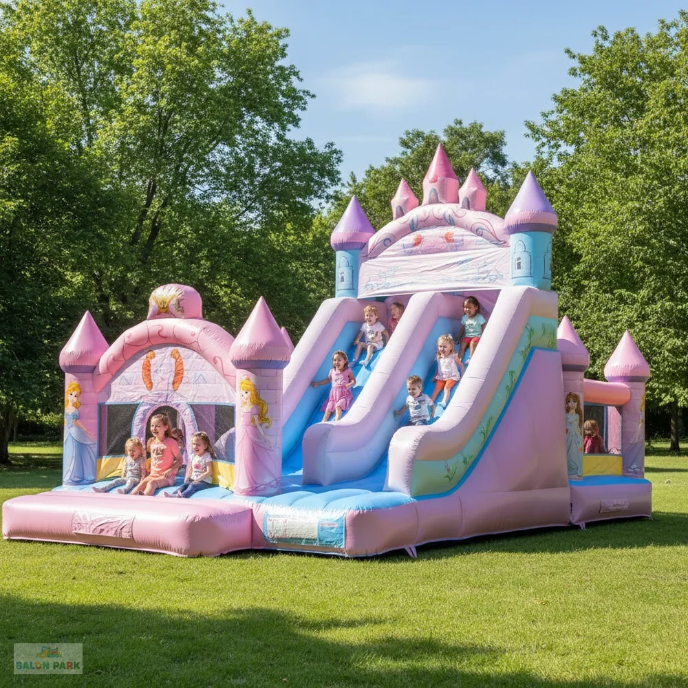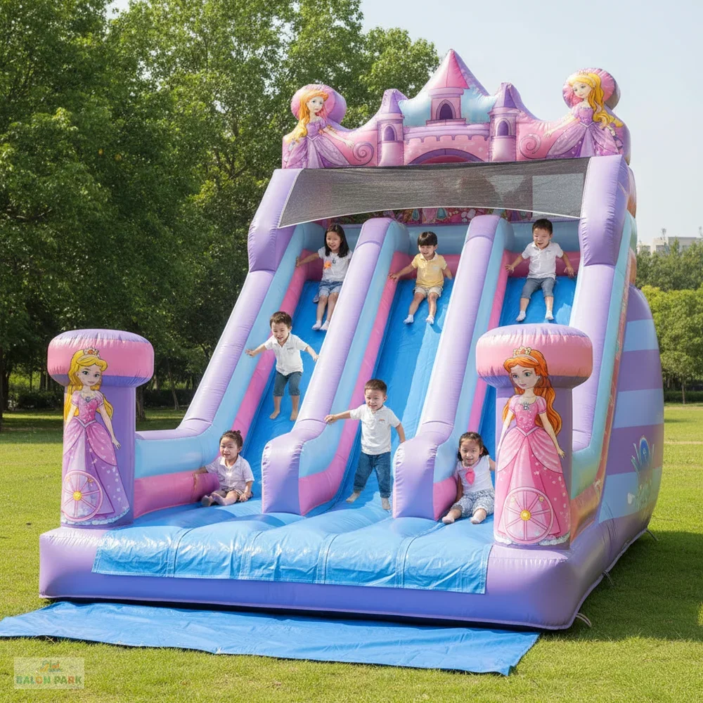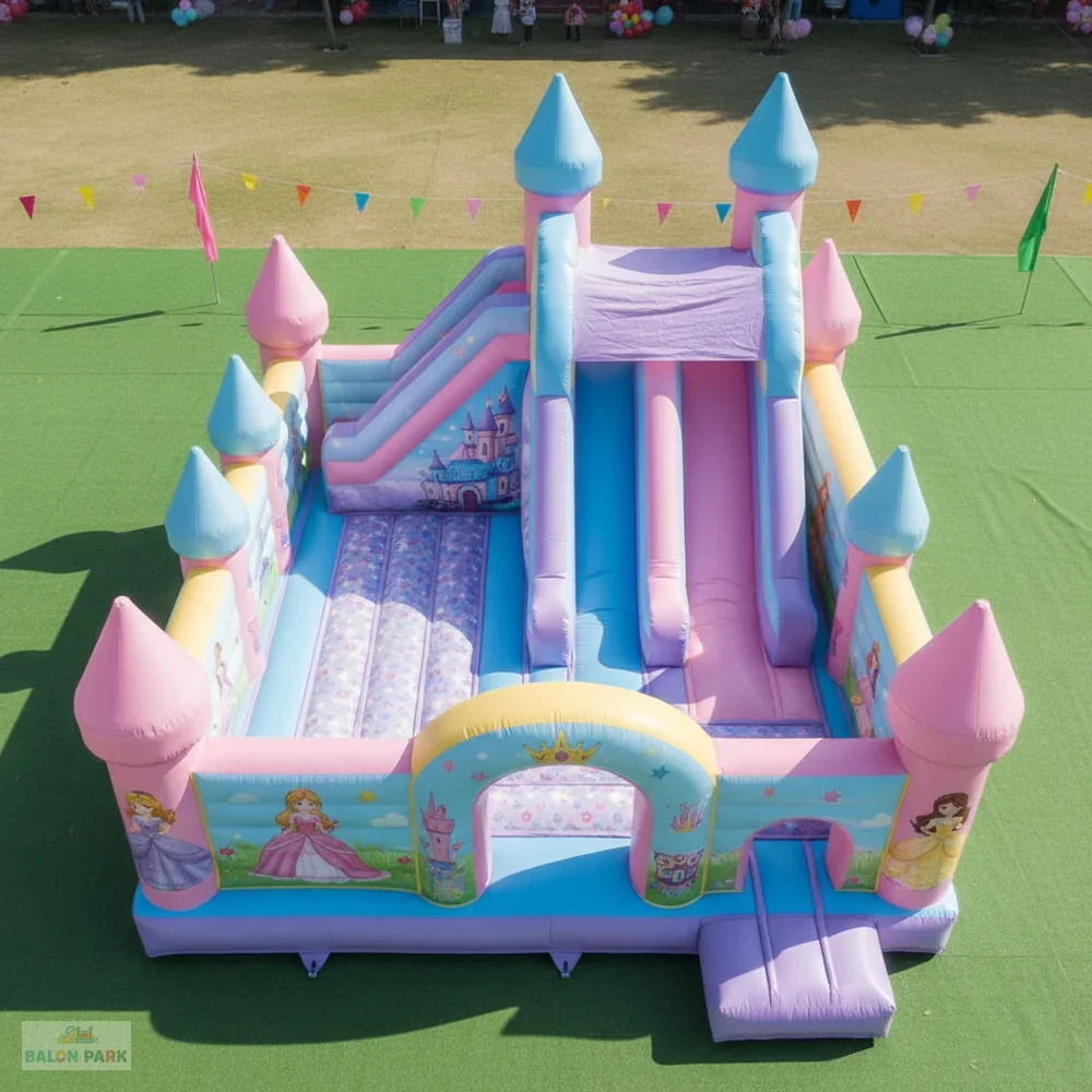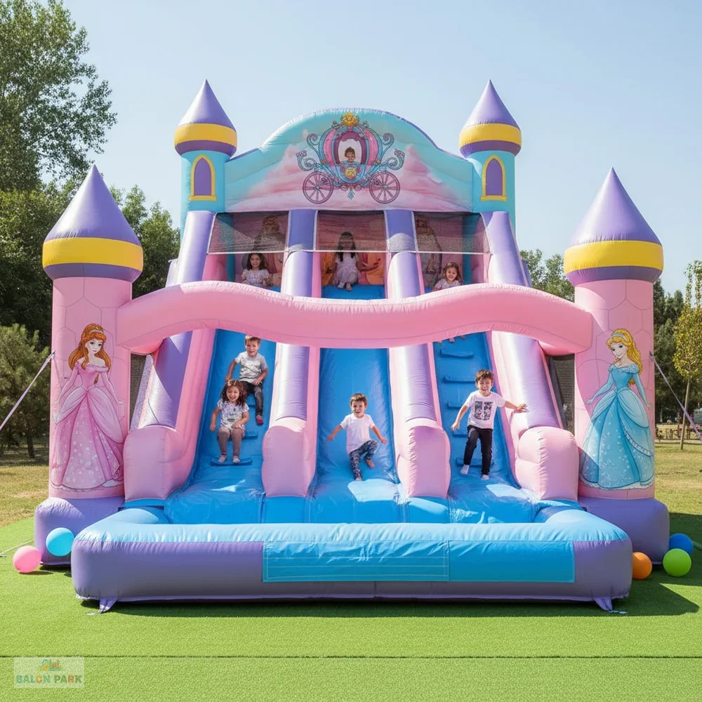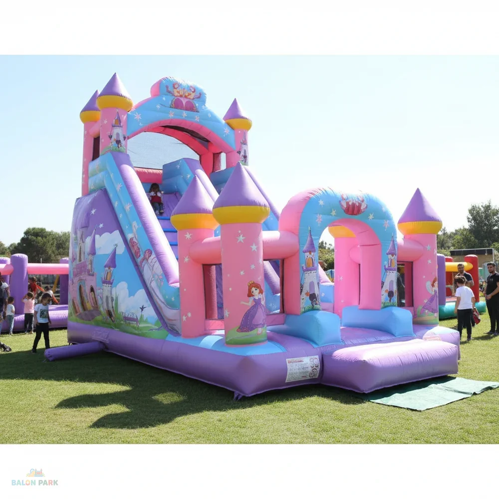 7x5 metre ölçülerindeki şişme prenses temalı kaydırak, masal dünyasını yansıtan zarif tasarımı ve geniş oyun alanı ile çocuk etkinliklerinin gözde eğlence ürünüdür. Prenses figürlü ve pastel tonlardaki dikkat çekici baskıları sayesinde doğum günü organizasyonları, okul şenlikleri, AVM etkinlikleri ve açık hava festivallerinde yoğun ilgi görür. Yüksek dayanımlı PVC branda malzemeden üretilmiş olup güvenlik fileleri, yüksek yan bariyerleri ve kaymaz tırmanma alanı ile maksimum güvenlik sağlar. 7x5 metre genişliği sayesinde aynı anda birden fazla çocuğun güvenle eğlenmesine imkan sunar.