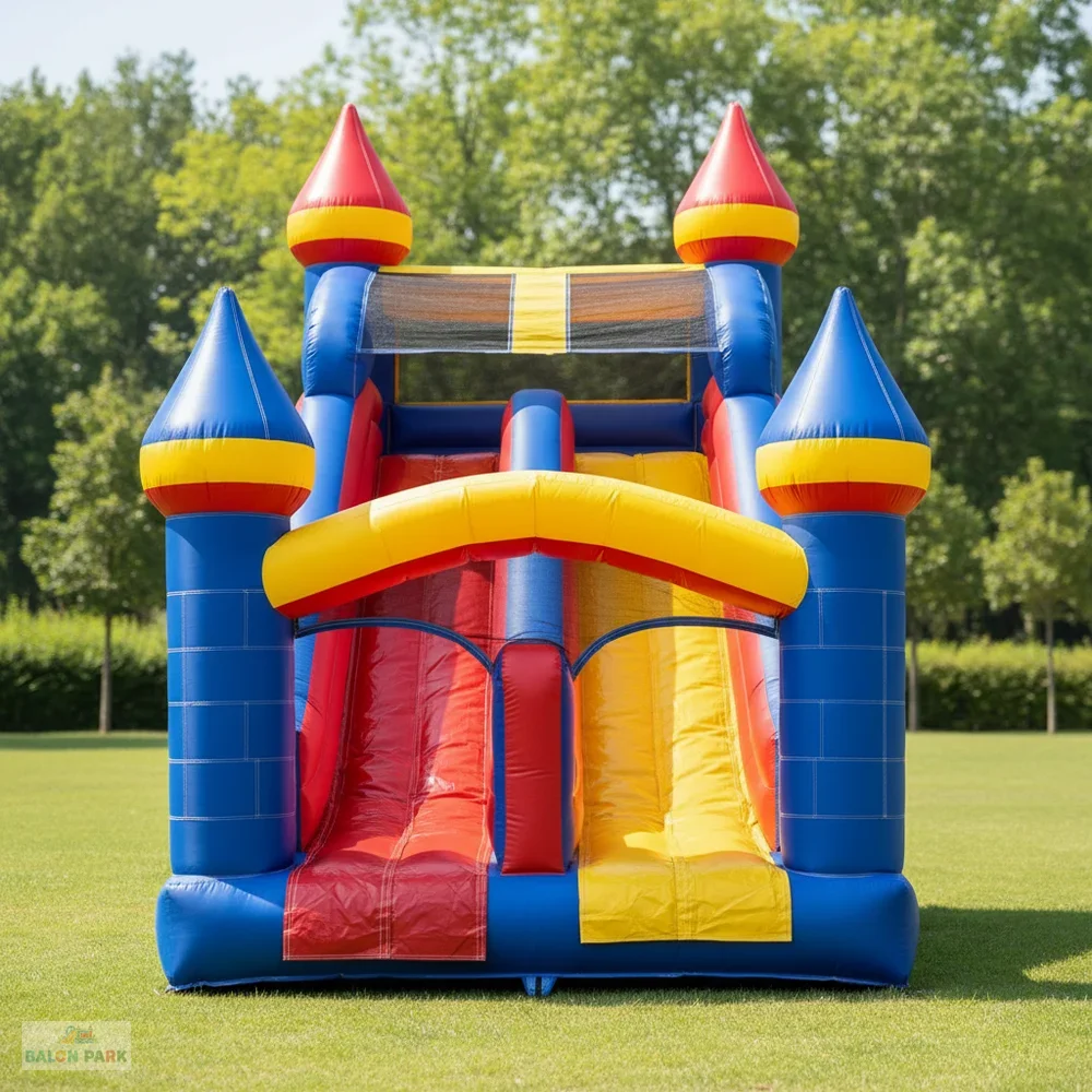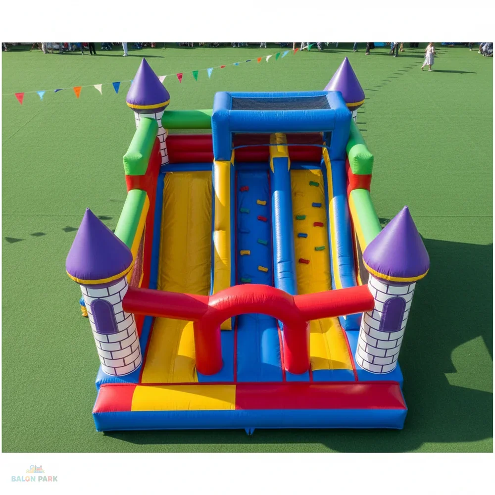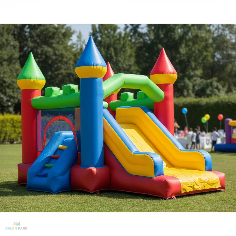 Şişme şato temalı kaydırak, masalsı kale tasarımı ve dikkat çekici kule detaylarıyla çocuklara eğlenceli ve güvenli bir kayma deneyimi sunar. Renkli şato konsepti sayesinde organizasyonlarda görsel olarak ilgi çekerken, geniş kaydırak yüzeyi ve güvenli tırmanma alanı çocukların enerjilerini güvenli şekilde atmalarına yardımcı olur. Yüksek dayanımlı PVC branda malzemeden üretilmiş olup çift dikişli güçlendirilmiş yapısı, güvenlik fileleri ve darbe emici zemin sistemi ile maksimum güvenlik sağlar. Doğum günü partileri, okul etkinlikleri, kreş organizasyonları ve açık hava etkinlikleri için ideal bir tercihtir. Kolay kurulum ve pratik taşıma avantajı sayesinde hem bireysel hem de ticari kullanıma uygundur.