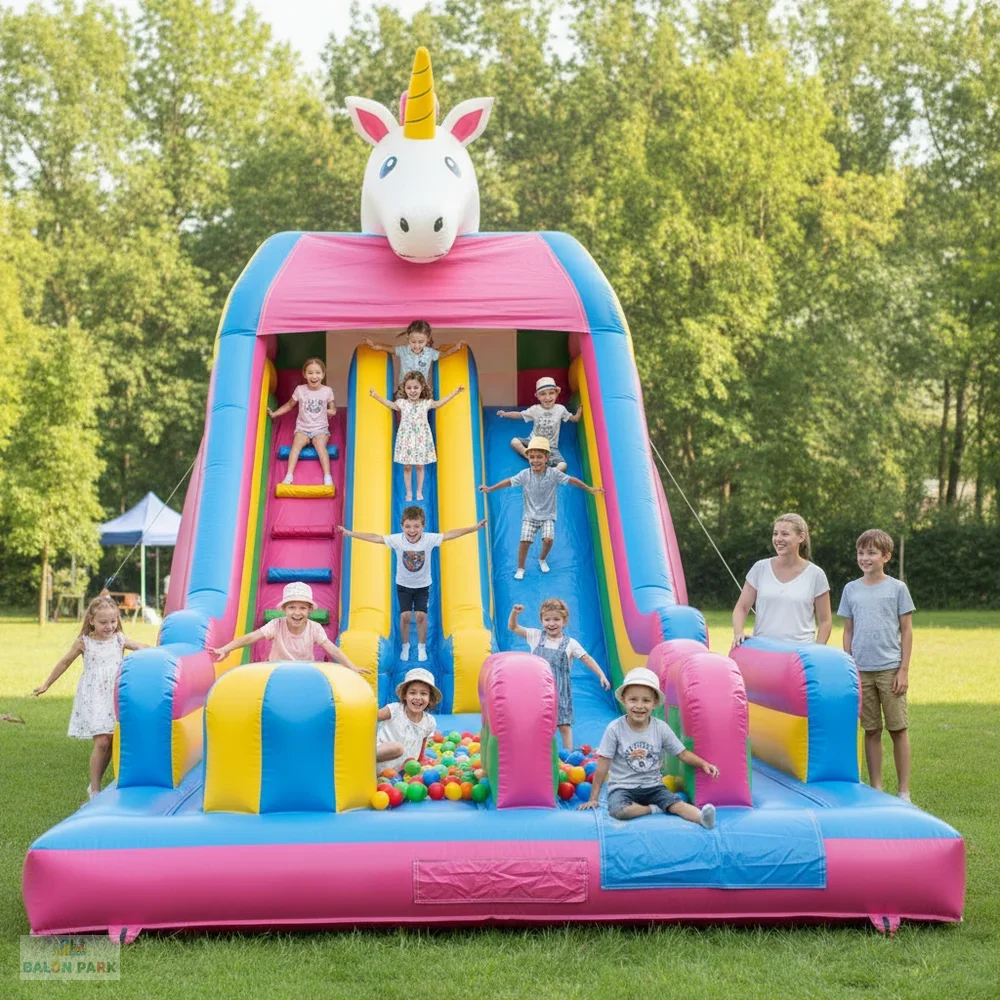 Şişme unicorn kaydırak, göz alıcı tasarımı ve sağlam yapısıyla çocuk etkinliklerinin vazgeçilmezidir. Dayanıklı malzeme, güvenli kayma alanı ve kolay kurulum özellikleri sayesinde kiralama firmaları, organizasyon şirketleri ve oyun parkları için yüksek kazanç potansiyeli sunar. Eğlenceli unicorn teması ile çocukların ilgisini çeker, işletmenize değer katar.