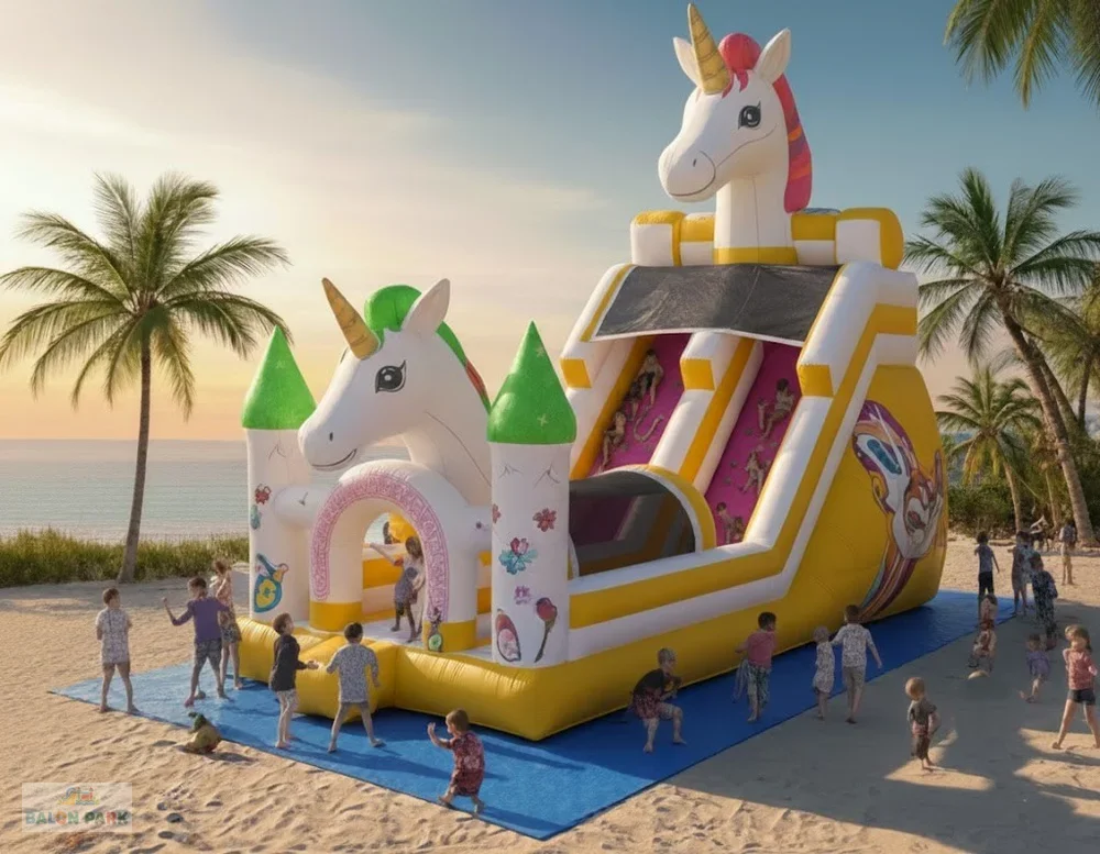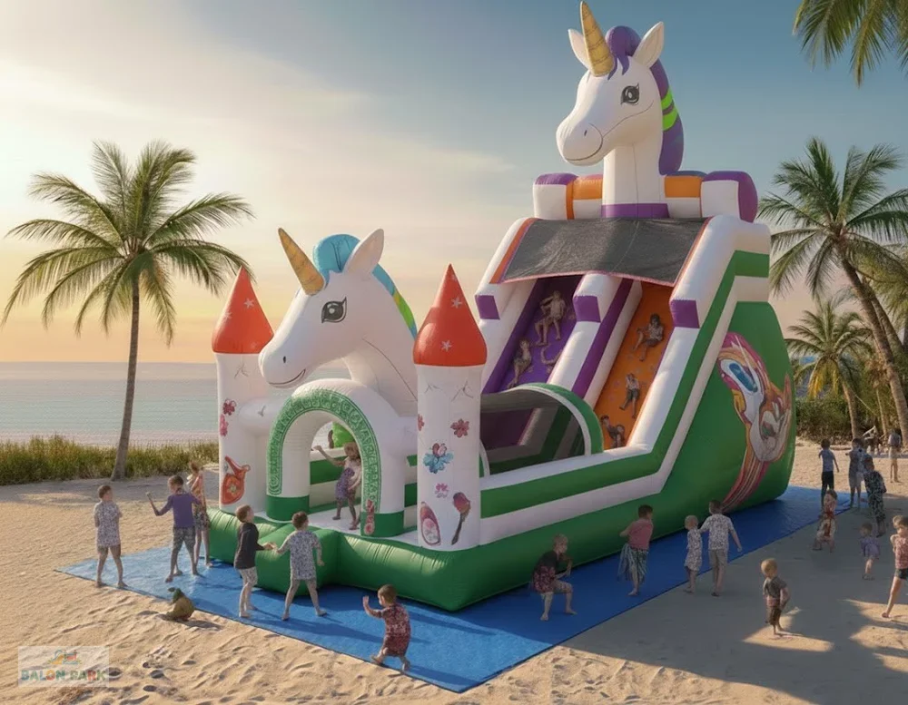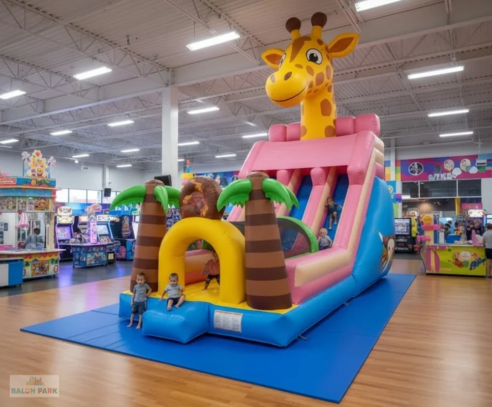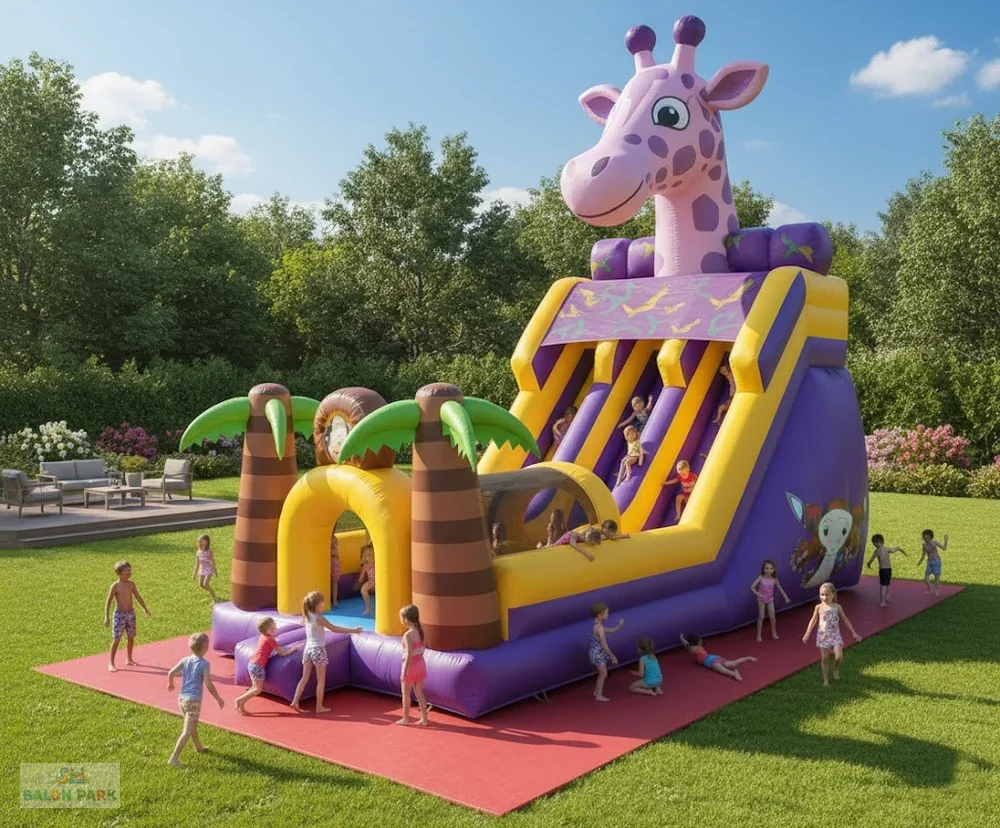 Zürafa kaydırak şişme; zürafa temalı tasarımı, dayanıklı PVC yapısı ve güvenli kaydırak alanı ile çocuklara eğlenceli bir deneyim sunar. Organizasyon ve kiralama hizmetleri için ideal, dikkat çekici ve kolay kurulumlu bir şişme kaydıraktır.